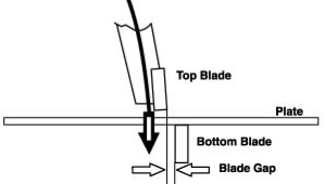 O processo de corte é levada a cabo numa máquina de corte, muitas vezes chamado um corte de energia ou um corte em quadratura, que pode ser operado manualmente (à mão ou pé) ou por pneumático, hidráulico, ou de energia eléctrica. A máquina de corte típico inclui uma tabela com braços de suporte para segurar a folha, orienta ou pára para proteger a folha, um gabarito para posicionar precisamente a folha, e as lâminas straight-edge superiores e inferiores. A folha é colocada entre a lâmina superior e inferior, os quais são então forçadas em conjunto contra a folha, o corte do material. Para a maioria máquina de corte da placa de metal, a lâmina superior é forçado para baixo, enquanto a lâmina inferior permanece estacionário. A lâmina superior é geralmente em ângulo de modo que o corte progride a partir de uma extremidade para a outra, reduzindo assim a força necessária. Além disso, a lâmina superior está ligeiramente desfasado a partir da lâmina inferior, cerca de 5-10% da espessura da folha. As lâminas utilizadas nestas máquinas de corte da placa de metal geralmente têm uma borda quadrada, em vez de uma faca de ponta, e estão disponíveis em diferentes materiais, como o aço de alto carbono e aço de baixa liga.
